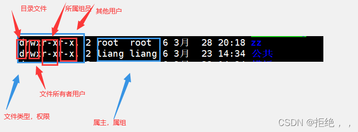 擁有該文件或目錄的用戶(hù)帳號(hào)屬組:擁有該文件或目錄的組帳號(hào)2.0 查看文件/目錄的權(quán)限和歸屬示例: