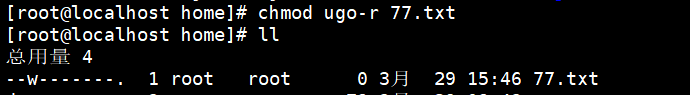 3.1.1.將文件77.txt去除所有人不可讀所有者可寫(xiě)權(quán)限:chmod ugo-r 77.txt