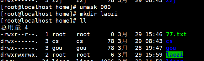 新建目錄laozi權(quán)限為所有人可讀可寫(xiě)可執(zhí)行umask 000mkdir laozi