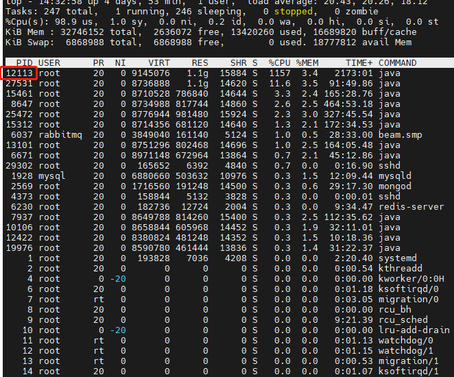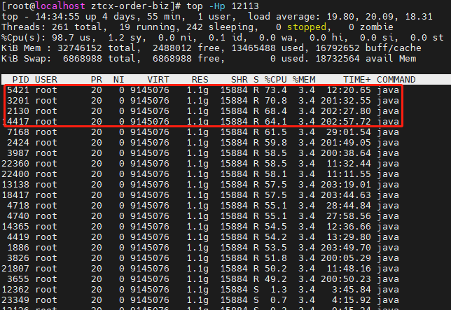 這里的PID是線程ID,可以看到,有幾個(gè)線程CPU占用過(guò)高。