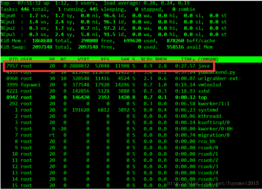 Linux如何定位Java進(jìn)程CPU利用率過(guò)高原因首先通過(guò)Top命令查看占用CPU較高的進(jìn)程PID,執(zhí)行Top之后按1可以查看每個(gè)核占用比例