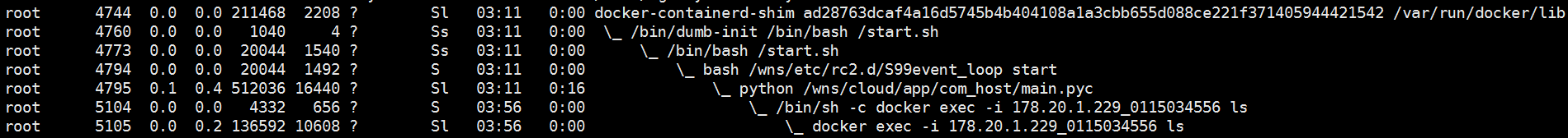 可以看到執行到了docker exec -i 178.20.1.229_0115034556 ls然后就卡死了