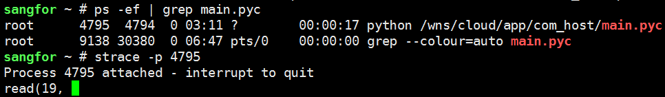 root 27678 0.3 0.4 512172 16500 Sl python /wns/cloud/app/com_host/main.pycroot 25011 0.0 0.0 4332 652 S \_ /bin/sh -c docker exec -i mongo_docker_master lsroot 25014 0.0 0.2 136592 10600 Sl \_ docker exec -i mongo_docker_master ls繼續用strace -p 27678跟蹤發現卡在read,文件描述符是14