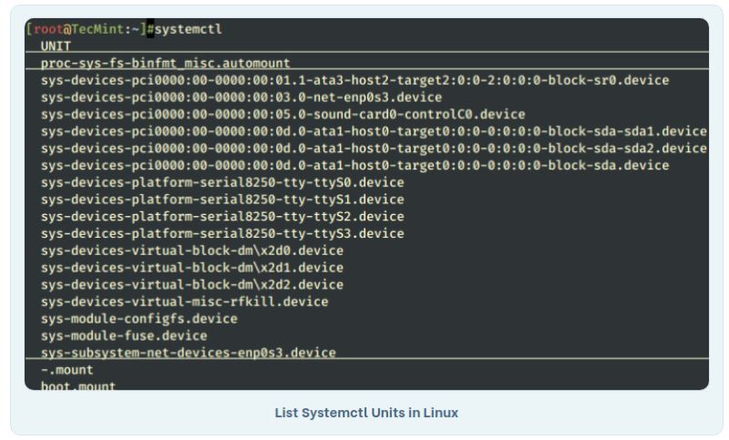 在 Linux 中列出 SystemD 下正在運行的服務(wù)當您運行不帶任何參數(shù)的 systemctl 命令時,它將顯示所有加載的 systemd 單元的列表(閱讀 systemd 文檔以獲取有關(guān) systemd 單元的更多信息),包括服務(wù),顯示它們的狀態(tài)(無論是否處于活動狀態(tài))。