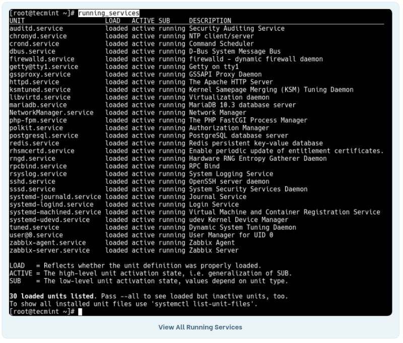 保存文件中的更改并關(guān)閉它。從現(xiàn)在開始,使用“running_services”命令查看服務(wù)器上所有已加載、正在運行的服務(wù)的列表。