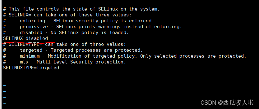 #修改配置項SELINUX=disabledvi /etc/selinux/config