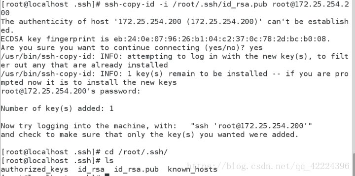 ssh-copy-id? -i? /root/.ssh/id_rsa.pub? root@172.25.254.200???? 加密sshd 服務(wù) 給服務(wù)主機(jī)加密就是上鎖會生成:authorized_keys 此文件出現(xiàn)表示加密完成