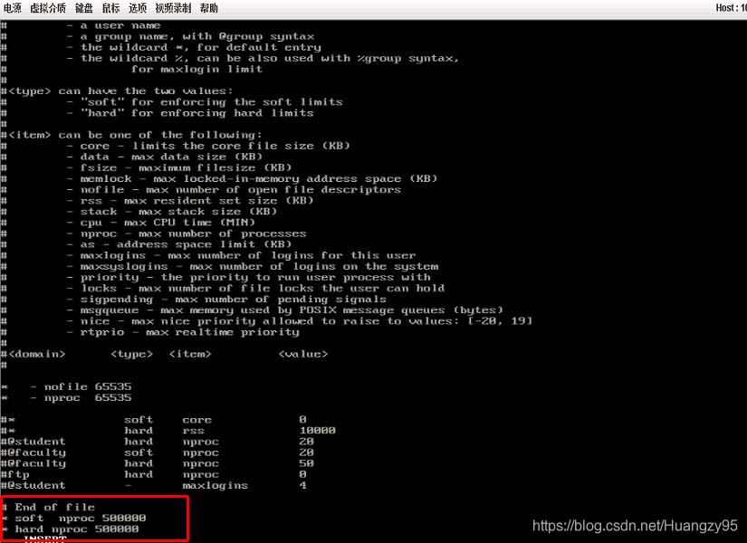vi /etc/security/limits.conf將前兩行帶*號的兩條數(shù)量變更為自己所需要的即可,部分修改完不會立即生效,可重啟測試。