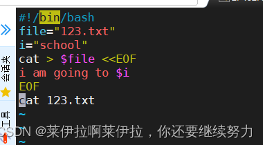 #!/bin/bashfile='123.txt'i='school'cat > $file <<EOFI am going to $iEOFcat 123.txt