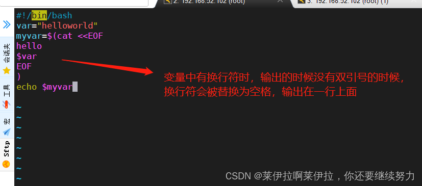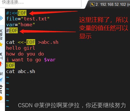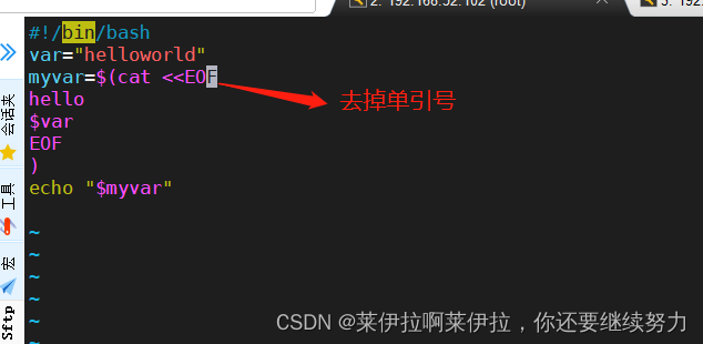 關(guān)閉變量替換的功能,按照字符原本的樣子輸出,不做任何修改或替換在通過一個腳本生成另一個腳本,另一個腳本涉及到變量的引用,此時使用‘’單引號,可以直接輸出變量形式。不至于另一個腳本出錯。或者在變量前面加上\取消$得特殊含義,即此處為\$var#!/bin/bashvar='helloworld'myvar=$(cat <<'EOF'#對標(biāo)記加單引號,即可關(guān)閉變量替換 hello$var #或者在這里添加上“\”即\$varEOF)echo $myvar