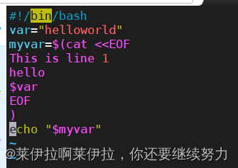#!/bin/bashvar='helloworld'cat <<-EOFhello $var123 456EOF