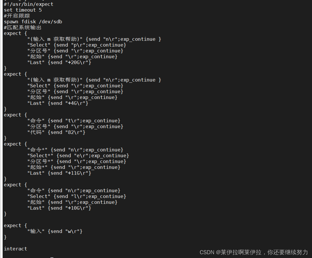 使用expect實現(xiàn)fdisk /dev/sdb 免交互創(chuàng)建分區(qū),要求一次性創(chuàng)建一個20G/dev/sdb1的普通分區(qū)和一個4G/dev/sdb的swap分區(qū)和一個邏輯分區(qū)10G /dev/sdb5