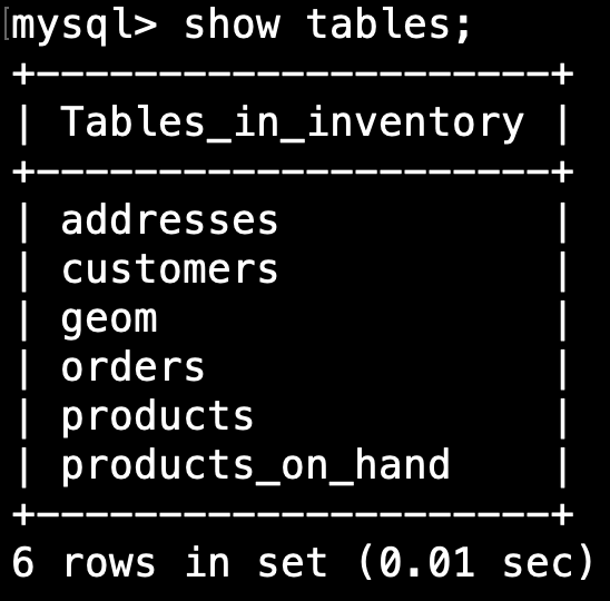 在我們繼續之前,我們將查看 debezium 鏡像提供給我們的數據庫 inventory 的結構,進入數據庫的命令行: