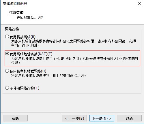八、進入選擇網絡類型界面,這里選擇默認配置(虛擬機安裝好以后可以在根據自己需要更改網絡配置),然后點擊“下一步”: