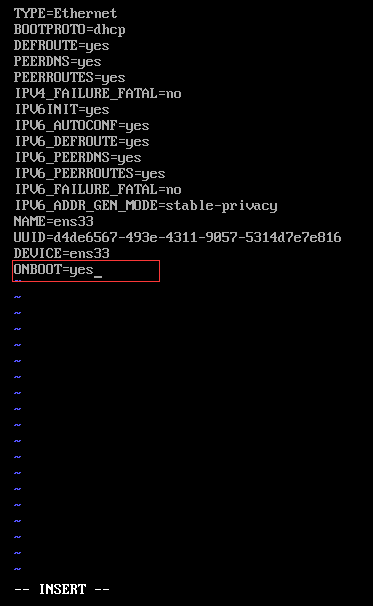 修改ONBOOT的值。按住鍵盤的方向鍵可以上下左右跳到光標的順序。將光標移動到ONBOOT,并按一次鍵盤上面的“i”,表示進入編輯模式: