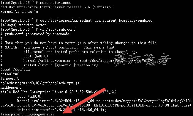 [root@getlnx06 ~]# more /etc/issue Red Hat Enterprise Linux Server release 6.6 (Santiago) Kernel \r on an \m [root@getlnx06 ~]# cat /sys/kernel/mm/redhat_transparent_hugepage/enabled [always] madvise never