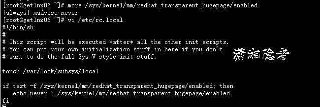 [root@getlnx06 ~]# vi /etc/rc.local#!/bin/sh## This script will be executed *after* all the other init scripts.# You can put your own initialization stuff in here if you don"t# want to do the full Sys V style init stuff. touch /var/lock/subsys/local if test -f /sys/kernel/mm/redhat_transparent_hugepage/enabled; then echo never > /sys/kernel/mm/redhat_transparent_hugepage/enabledfi