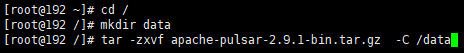 切換到根目錄:$ cd /?創建data目錄:$ mkdir data解壓:$ tar -zxvf apache-pulsar-2.9.1-bin.tar.gz