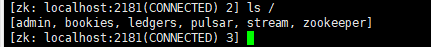 bin/pulsar zookeeper-shell進入zk控制臺,通過ls /查看所有zk節點。能看到bookies,ledgers等節點,則說明初始化成功了。如果需要關閉zookeeper,可使用命令bin/pulsar-daemon stop zookeeper