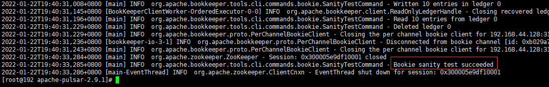 bin/bookkeeper shell bookiesanity出現Bookie sanity test succeeded則代表啟動成功。如果需要關閉bookkeeper,可使用命令bin/pulsar-daemon stop bookie