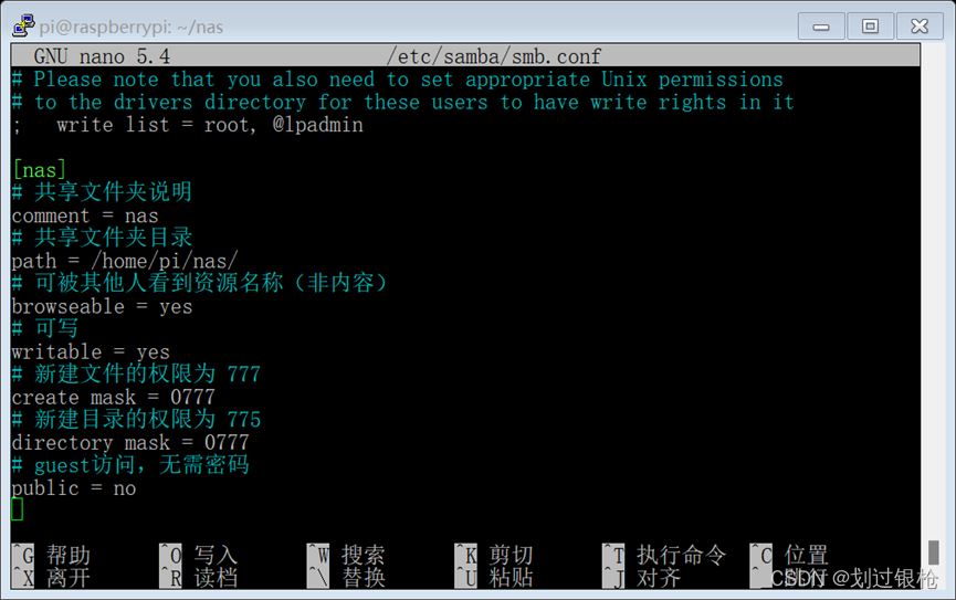 在文檔末尾加入: [nas]# 共享文件夾說明comment = nas# 共享文件夾目錄path = /home/pi/nas/# 可被其他人看到資源名稱(非內容)browseable = yes# 可寫writable = yes# 新建文件的權限為 777create mask = 0777# 新建目錄的權限為 775directory mask = 0777# guest訪問,無需密碼public = no