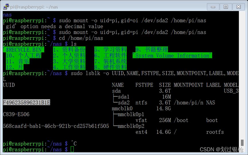 sudo mkdir /home/pi/nassudo mount -o uid=pi,gid=pi /dev/sda2 /home/pi/nas