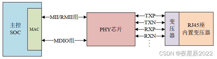 內部的 MAC 外設會通過 MII 或者 RMII 接口來連接外部的 PHY 芯片, MII/RMII 接口用來傳輸網絡數據。另外主控需要配置或讀取 PHY 芯片,也就是讀寫 PHY 的內部寄存器,所以還需要一個控制接口,叫做 MIDO, MDIO 很類似 IIC,也是兩根線,一根數據線叫做 MDIO,一根時鐘線叫做 MDC。