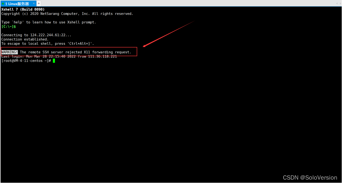 - 7. 上圖出現(xiàn)了一個警告“The remote SSH server rejected X11 forwarding request.”意思是“遠程SSH服務器拒絕X11轉(zhuǎn)發(fā)請求。”
