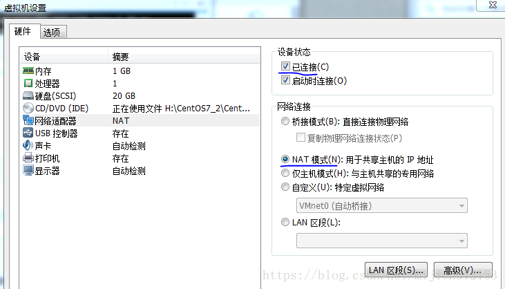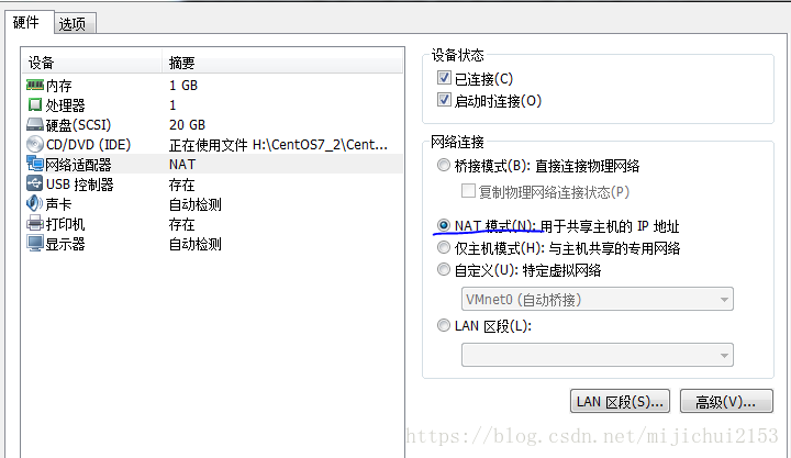 2、虛擬機→設置→網卡適配器的配置如下圖