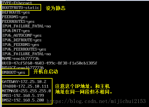 TYPE=EthernetBOOTPROTO=static#設為靜態IPDEFROUTE=yesPEERDNS=yesPEERROUTES=yesIPV4_FAILURE_FATAL=noIPV6INIT=yesIPV6_AUTOCONF=yesIPV6_DEFROUTE=yesIPV6_PEERDNS=yesIPV6_PEERROUTES=yesIPV6_FAILURE_FATAL=noNAME=eno16777736UUID=4e7cd244-798d-4f4f-9f37-cef0be3765f6DEVICE=eno16777736ONBOOT=yes#改為yesGATEWAY=10.14.150.2#網關IPADDR=10.14.150.111#子網IPNETMASK=255.255.255.0#子網掩碼DNS1=10.10.0.21 #根據宿主機來的DNS2=114.114.114.114 #根據宿主機來的