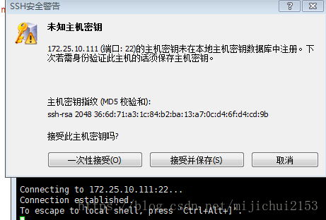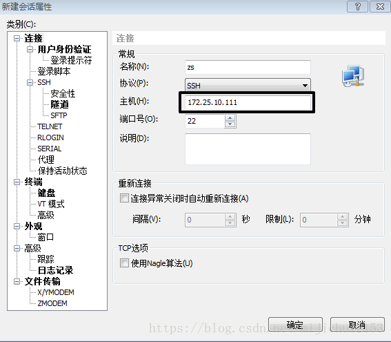 (2)主機欄里填入linux虛擬機的ip地址(就是第三步的ADDR),其他那要求填寫。點擊確定