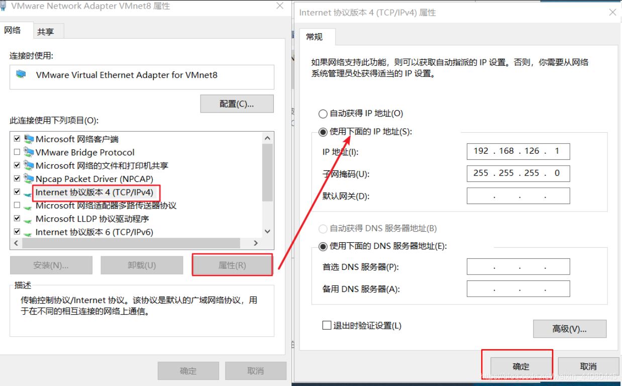 選擇VM8后按照如下進行配置,注意圖里面的ip地址配置是這樣的,在博客第一張圖中右下角可以看到一個子網IP,假如我們的子網IP是192.168.10.0,里面IP地址就填寫192.168.10.1,子網IP是192.168.20.0,里面IP地址就填寫192.168.20.1