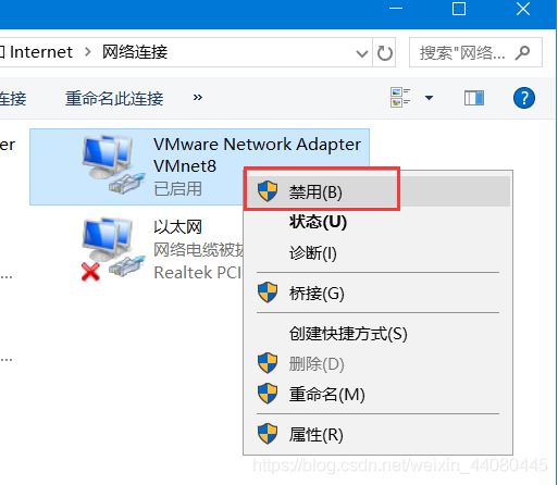 此時點擊確定以后我們在點擊一下VM8的禁用,點擊完以后禁用再右鍵單擊一下啟用,這時再去ping下linux的主機IP就能通了(雖然有點sb的操作,但是我試過了貌似只有這樣才可以,就像重啟操作一樣,其實在很多時候windows下ping不通linux我們都可以先禁用一下VM8然后在啟用它基本上就解決了)