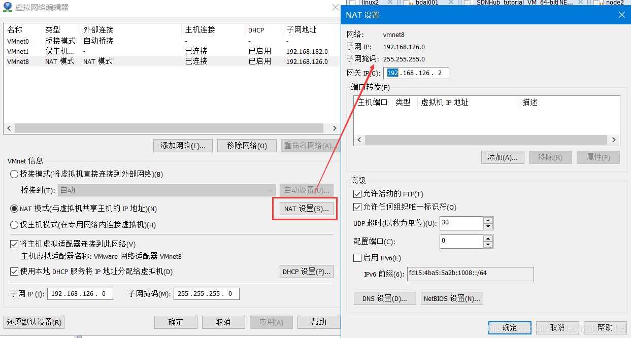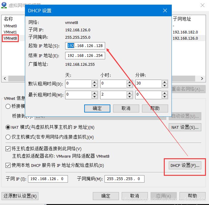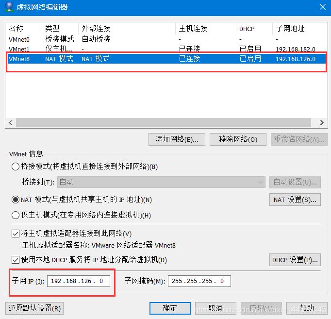 2.當我們虛擬機是很多linux組成的集群時,在使用上面的修改配置文件的辦法就顯得比較麻煩了,可以按照之前配置文件ifcfg-ens33中的信息來修改VM8的子網IP,NAT設置,DHCP中的值,注意在DHCP中只要修改它的起始IP和結束IP中的第三例的數據就行了,其他的和之前沒有發生變化。修改好以后在點應用和確定就可以了。