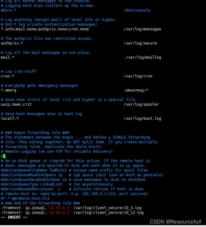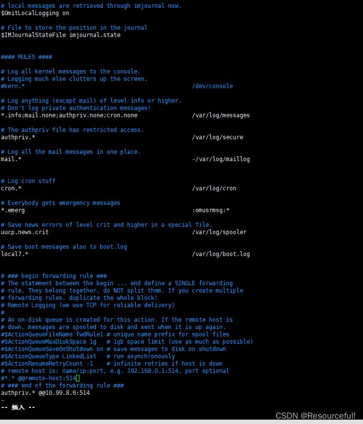 在第90行(附近也行)輸入以下代碼,authpriv代表所有級別的登錄日志,@@代表tcp,172.168.2.100代表目標ip,514代表目標端口號,保存退出