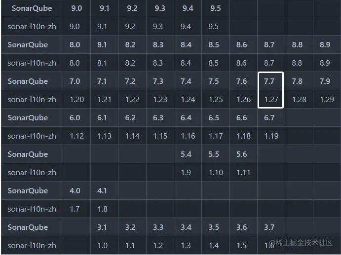 這就需要我們去網上找中文包:github.com/xuhuisheng/…在該頁面可以看到版本對應關系:即本次 7.7版本的SonarQube 對應的是 1.27 的中文安裝包。