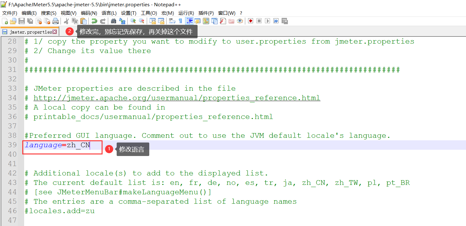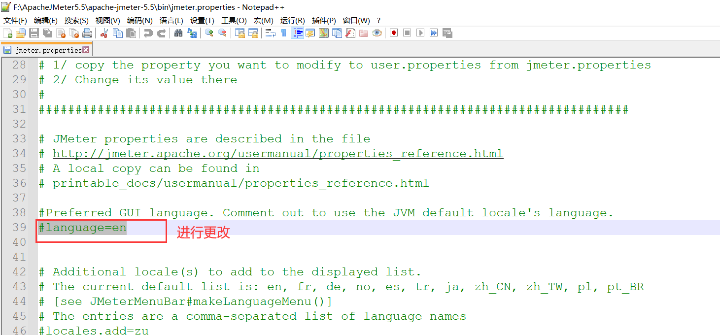 在安裝目錄的bin目錄中找到 jmeter.properties,右鍵使用文本編輯器打開,這里我用的notepad++