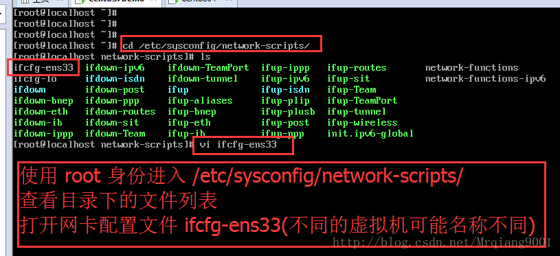 使用 root 用戶登錄虛擬機,進入到 /etc/sysconfig/network-scripts/ 目錄下,查看虛擬機的網卡設置,使用 vi 打開 ifcfg- 開頭的文件( - 后邊為網卡名稱) ,打開之后,對其進行修改
