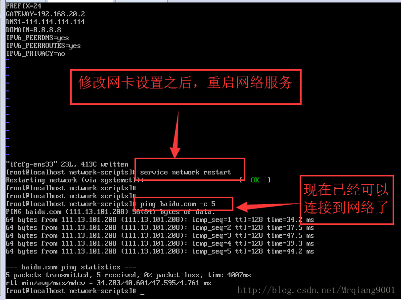 修改完畢之后,重啟網絡服務 service network restart 或者 systemctl restart network.service