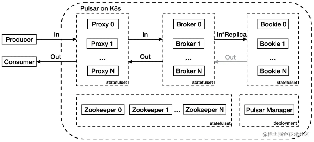 原生部署架構中,流量從 Proxy 代理層進入,經過 Broker 邏輯服務層寫入 Bookie 存儲層。Proxy 代理層代理客戶端和 Broker 之間的連接,Broker 層管理 Topic,Bookie 層負責持久化消息存儲。在上圖中,入流量和出流量分別用 In 和 Out 進行標記,Replica 是配置的副本。
