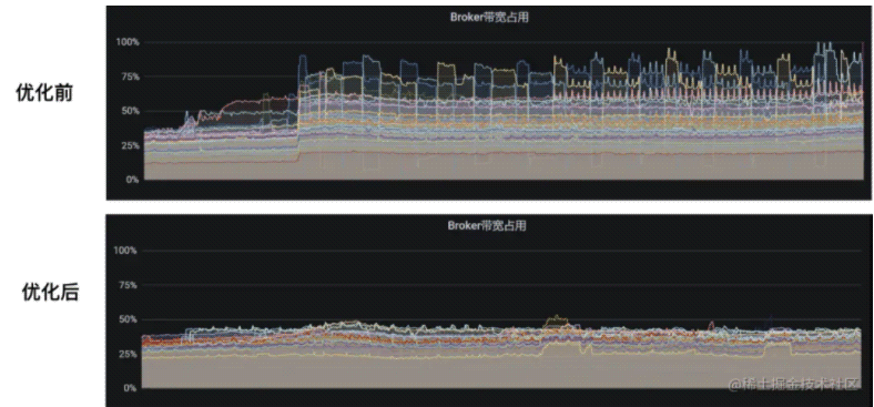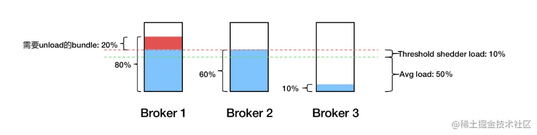 如上圖,假設三個 Broker 平均負載是 50%,則閾值就是 60%,超出 60% 的部分需要均衡。但實際應用中發現 Broker 1 的多余 20% 負載會卸載到 Broker 2 上,之后由于 Broker 2 超載所以又會卸載下來,還會回到 Broker 1 上。結果流量就在 Broker 1 和 Broker 2 上反復橫跳。