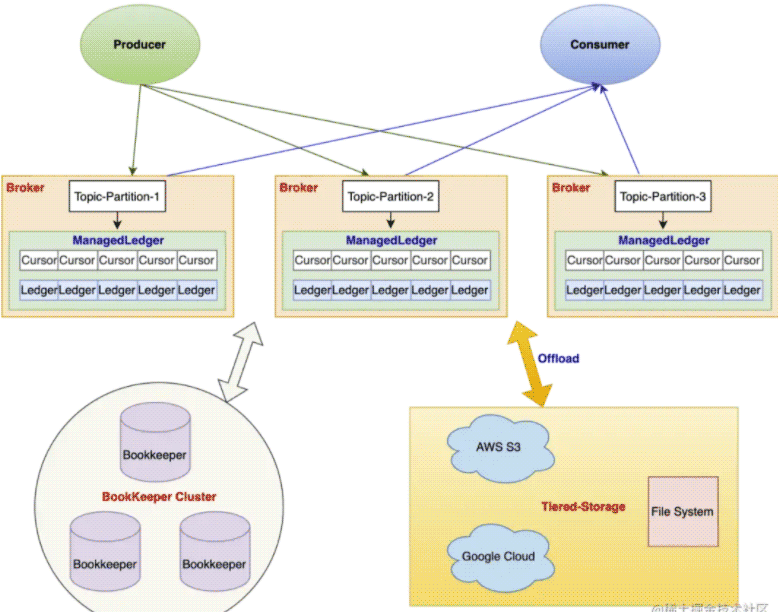 Pulsar 提供了分層存儲能力,可以將存儲轉移到廉價的存儲層。Pulsar Offloader 可以將超過一定時長的 Ledger 搬運到遠端存儲,不再停留在 Bookie 層,由 Broker 接管這部分的數據管理。