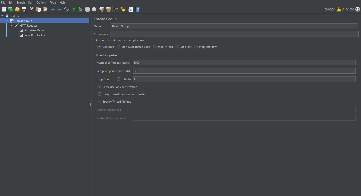 創(chuàng)建一個(gè)線程組,我這設(shè)置了1000個(gè)線程數(shù),時(shí)間設(shè)為0.01秒