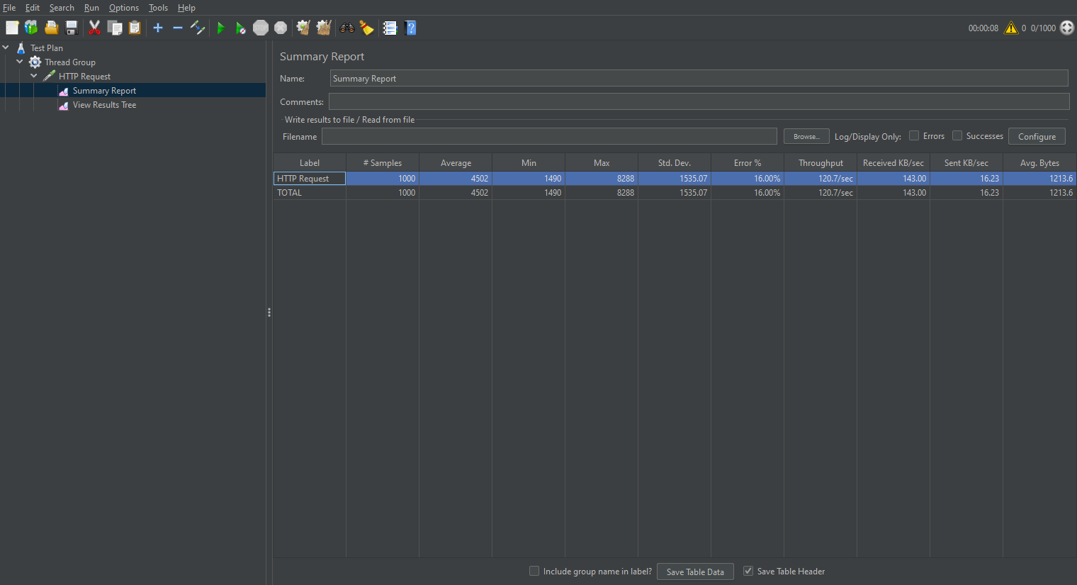 測(cè)試結(jié)果顯示,請(qǐng)求失敗率為16%,因此我這小破服務(wù)器,基本上1000個(gè)并發(fā)請(qǐng)求都難以滿足。