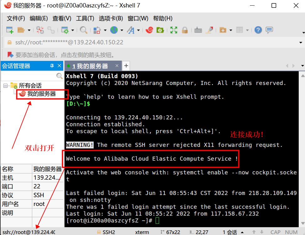 5、在剛才建的會話雙擊打開,會看到Welceom to......,同時左下角會顯示服務器ip地址,說明已經連接了。