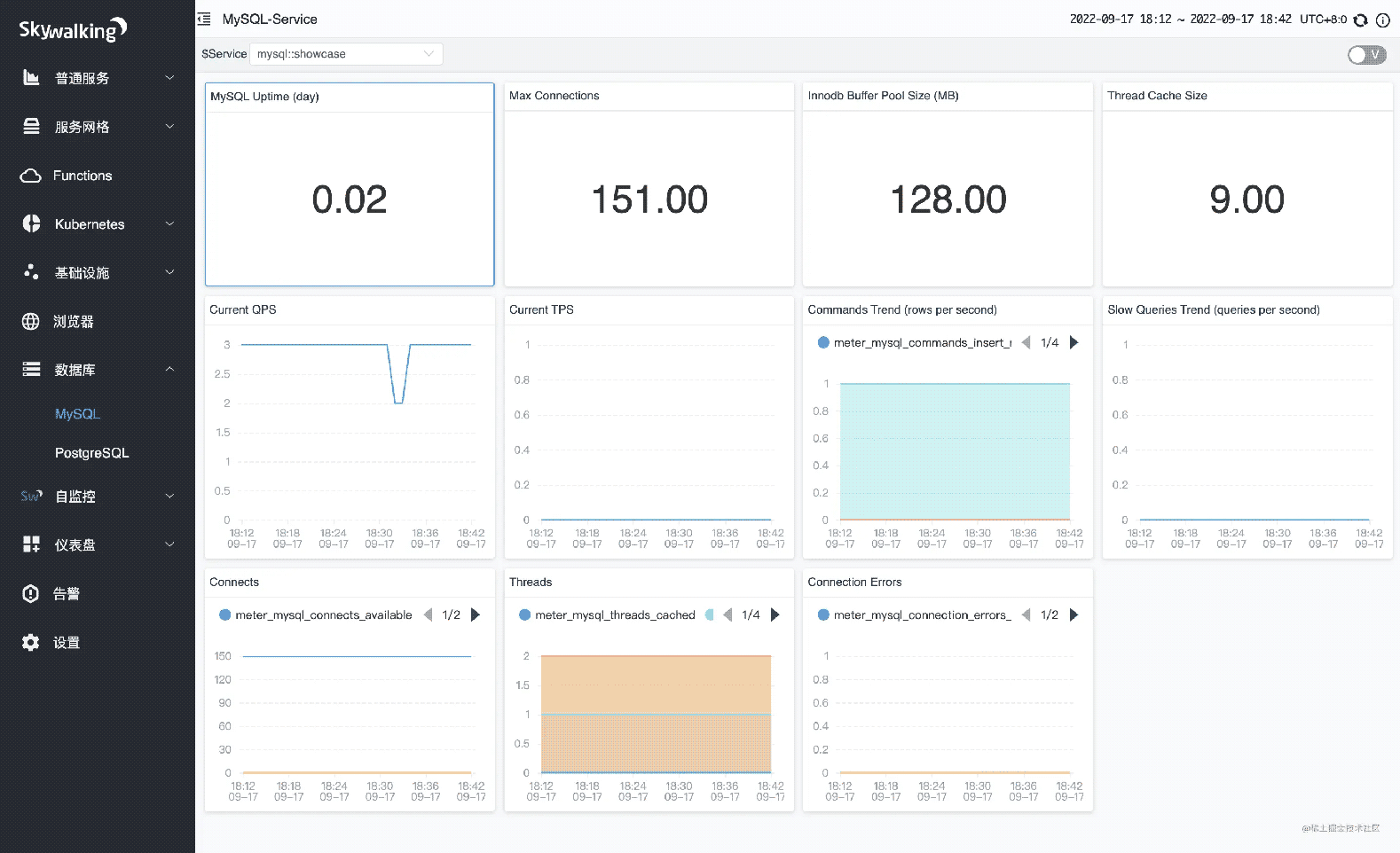 mysqld-exporter 和 otel-collector 服務能正常采集數據之后,我們可以訪問 SkyWalking UI,可以查看到 MySQL Sever 端的監控信息了。
