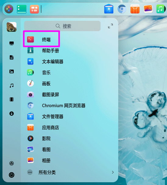 1、點任務欄上的啟動器,找到并單擊打開終端。