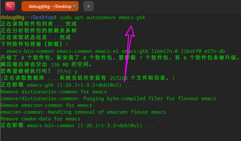 2、sudo apt autoremove 后面接軟件包,在終端可以卸載軟件,如下圖所示,用于卸載emacs。