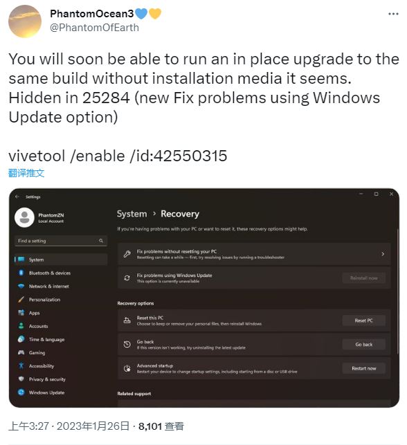 這是一項被稱為“使用 Windows Update 更新修復問題”或“修復升級 / 修復安裝”的新功能,目前可借助 vivetool /enable /id:42550315 開啟。