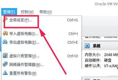 解決上面的問題,首先運行virtualbox,點擊”管理“,選擇”全局設定“。